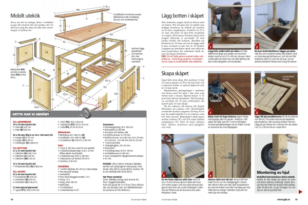 De tre sidorna och dörren till skåpet tillverkas på samma sätt. Kontrollmät avståndet mellan sargerna (D resp. E) så har du exakt höjd för två av sidorna, som bör sitta stramt. Bakstycket skall passa mellan sidorna (F1 och F4) samt mellan ramdelarna (C). Fäst de fasta sidorna först. Dörren monteras med gångjärn och vred.