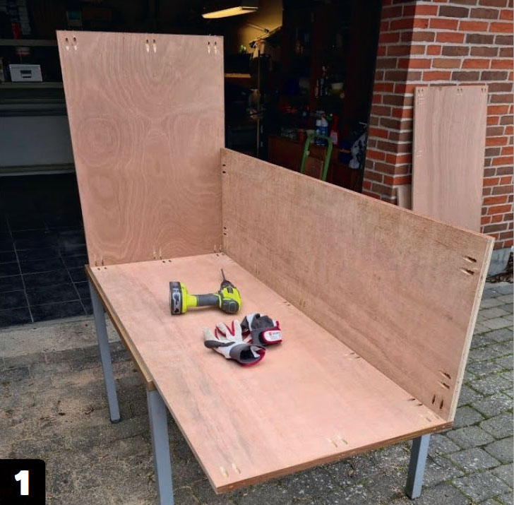 Stommarna har strukits med ett lager färg på ytan på de råa byggskivorna. Dessutom har det satts en lodrät stötta under grillbänken. Det har även satts stående reglar bakom stommarna.