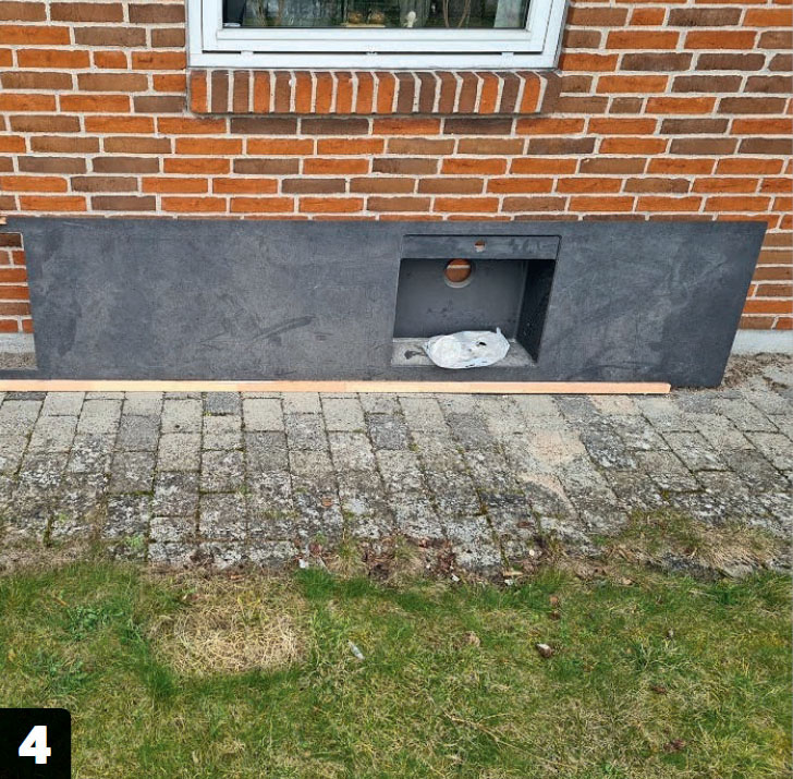 Vindskärm och lådor. Till vänster om vasken har satts tre specialbyggda lådor som ger gott om förvaring. Dessutom har en vindskärm av svarta brädor satts bakom bänken.