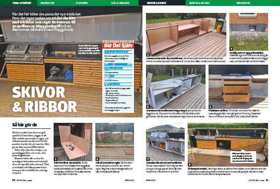 Det här projektet har, förutom grill, spishäll och bänkskiva, byggts av trä. Från sockeln, som består av reglar, och skåpsstommarna av plywood till ribbpanalen, handlar det om bara trä, vilket ger en skön sammanhållen känsla.