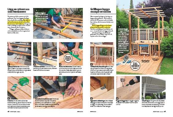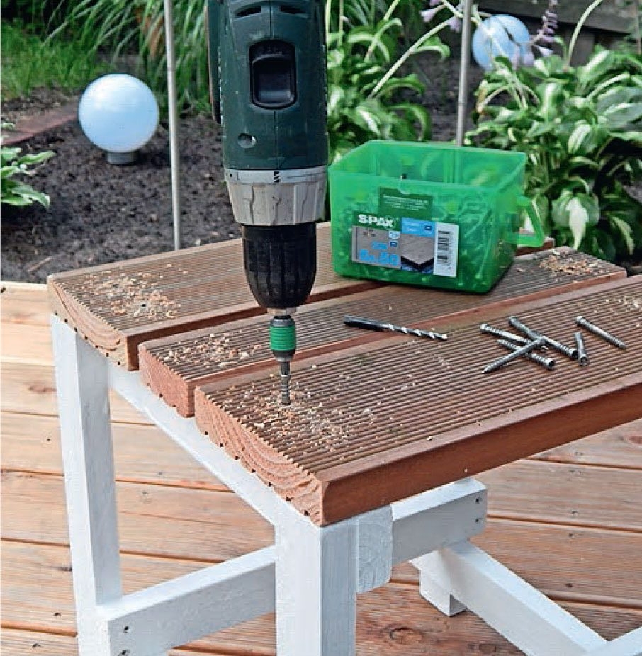 Märk ut för skruvarna. Det ser finast ut om skruvarna i terrassen sitter precis mitt för varandra. Detta säkerställer vi genom att märka ut med en linjal eller ett vattenpass.