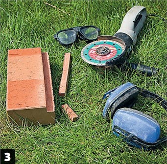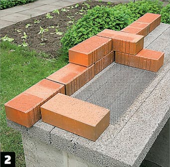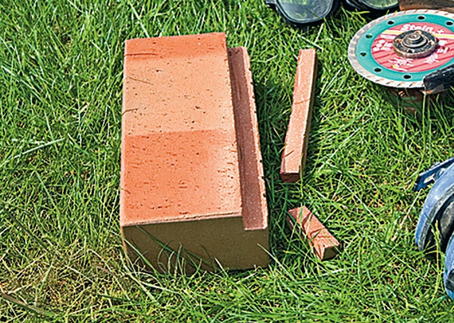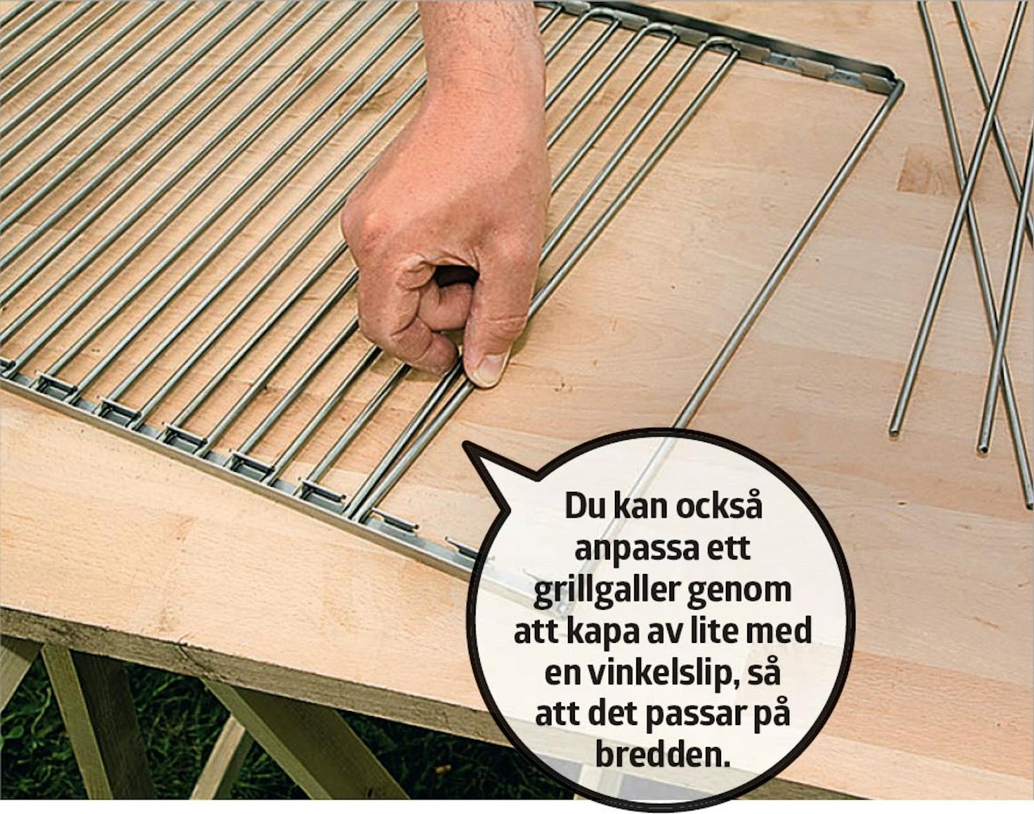 Kapa av kanten på de tegelstenar som ska användas för grillgallret. När kanten kapats av med ett vinkelrätt snitt, kan du göra ett spår som passar till grillgallret. Använd vinkelslip och säkerhetsutrustning.