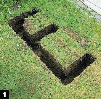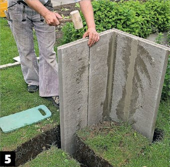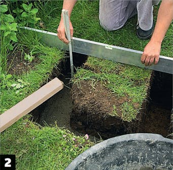Gräv ut, så att de långa betongblocken kan ställas lodrätt i marken. Stenarna ska gå ner i marken ca. 34 cm, så rännan ska vara lite djupare än så, omkring 40 cm.
