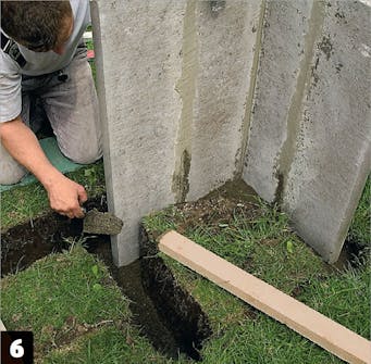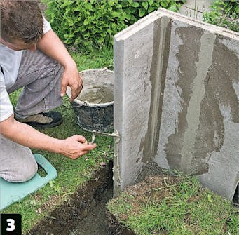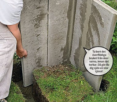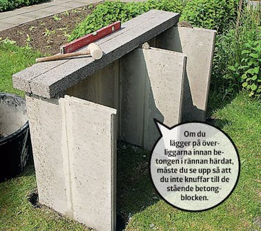 Häll betong i botten av rännan, så att blocken gjuts fast. Kolla så att rännan har det rätta djupet innan du häller i betongen. En torrbetong, som bara ska blandas med vatten, passar bra till ändamålet.
