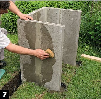 Placera nu stenarna i betongen. De ställs på högkant och fogas med murbruk, så att de bildar ett stabilt fundament. Murbruket rörs ut i vatten och fästs på sidorna med en murslev.