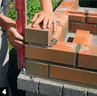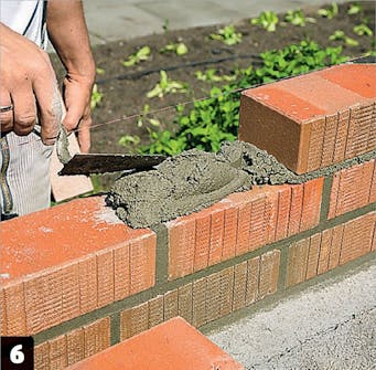 Bygg upp tegelmuren längs kanten. Kolla med vattenpass så att varje sten du lägger är rätt placerad. Det första skiftet tegelsten läggs 3 cm från kanten.