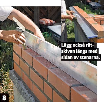 Kolla med en rätskiva när du är färdig med ett skift sten, så att de ligger jämnt. Rätski-van läggs både på och längs med stenarna. Rätta eventuellt till stenarna med skaftet på mursleven.