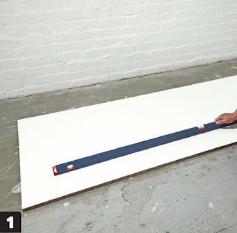 Placera en skiva i formplywood på en plan yta, som du kan gjuta bänkskivan på. Det är viktigt att skivan ligger helt plant. Kontrollera med vattenpasset, och klossa ev. upp skivan om det behövs.