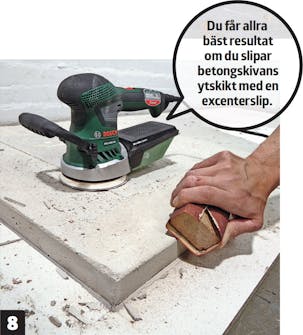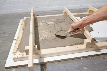 Gör ytan så jämn som möjligt när formen är fylld. En murslev fungerar bra till detta. Nu ska betongen vibreras så att ev. luftbubblor försvinner. Det kan du göra genom att slå på formen med en hammare t.ex.