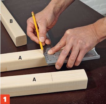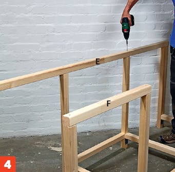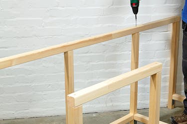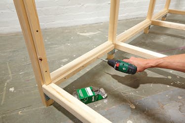 Gör fast tvärreglarna (B). Lägg först på trälim för att göra fogen extra stark, innan du skruvar fast den med 4,5 x 70 mm skruv. En skruv i varje ände räcker.