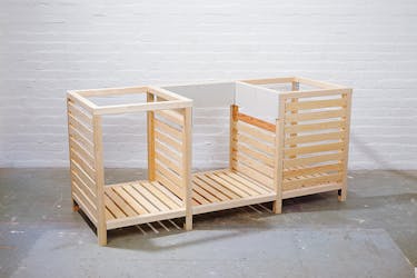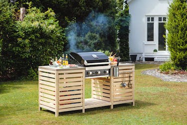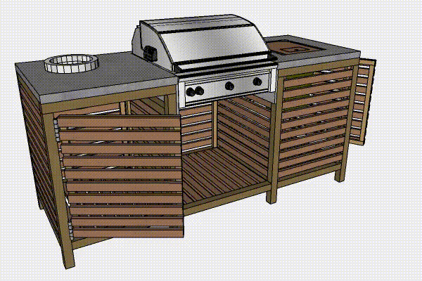 Trästommen byggs av reglar i tre lika stora moduler, så att de bildar ett underskåp, där bänkskivan med grillen vilar ovanpå.