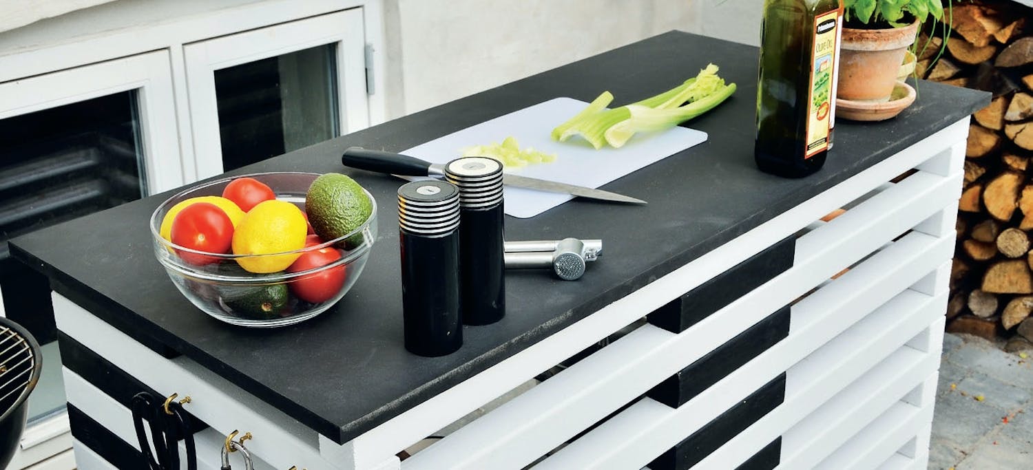 De längsta reglarna används till grillbordets framsida, och de på 50 cm till bordets två sidor. De kortaste används som distansklossar mellan reglarna och den svarta färgen utgör en fin kontrast.
