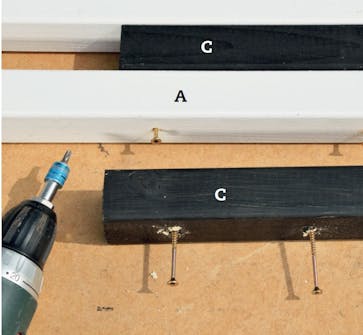Skruva fast de fyra bottenlisterna (G och H) som stöd för bottnen, när den läggs på plats. Bottnen är inte nödvändig, men det är svårt att flytta lådan om den inte har botten och är full av blommor.