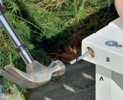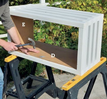 Spika fast locket (E) på ramen med 40 x 2 mm galvaniserade dyckertar. Tvingarna håller fast locket i rätt position medan du spikar.