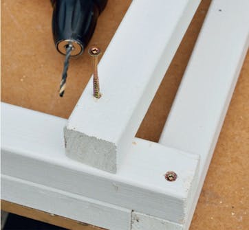 Skruva ihop de två ihopsatta reglarna med två långsidereglar (A). Lådan sätts ihop från undersidan och det innebär att den ska vändas när den är klar. Då ser man inte längre skruvhuvudena.