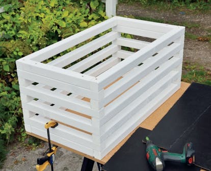 Måla reglarna och den oljehärdade masoniten och låt färgen torka innan du sätter ihop delarna. Grunda med grundningsolja och stryk delarna två gånger med heltäckande utelasyr.