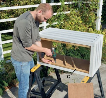 På insidan fästs plywoodskivor och till sist monteras fyra ben under lådan, så att den kommer upp en bit.
