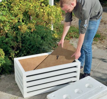Lägg bottnen (F) på plats. Det är inte nödvändigt att skruva fast den om du sätter en planteringslåda på den.