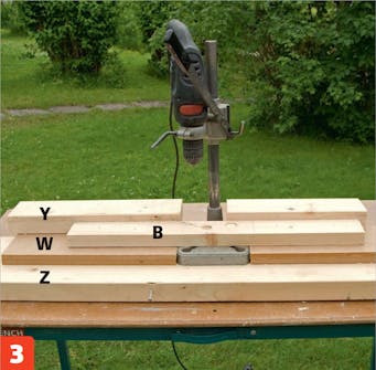 Vi bygger en borrmall med ett borrstativ som borrmaskinen kan spännas fast i. Planet (W) och anslaget (Y) skruvas på en botten (Z), så att vi är säkra på att borra vinkelrätt ner precis 2 cm från bakkanten.
