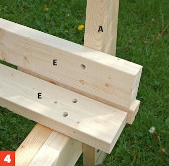 Kryssbenet monteras med en vagnsbult. De två benen (A) ska passa så bra att de bildar en rät vinkel. De sätts ihop med en bult precis som bänkbenen. Här går borret rakt igenom på en gång.