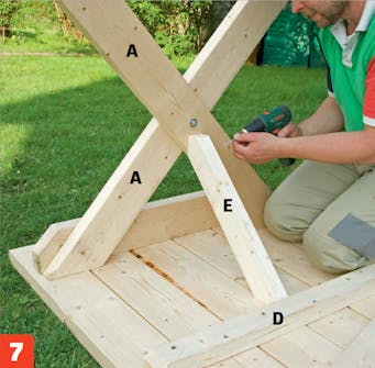 Bordet förstärks på undersidan med två tvärslåar (D) och två snedsträvor (E) - ungefär som vi gjorde med bänken. Tvärslåarna fästs först, sedan snedsträvorna.