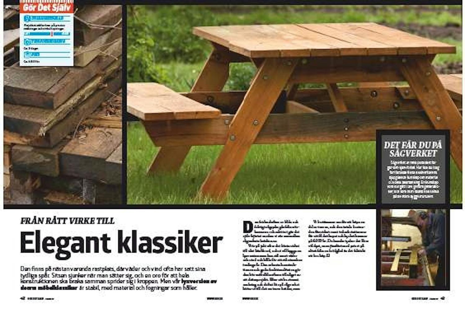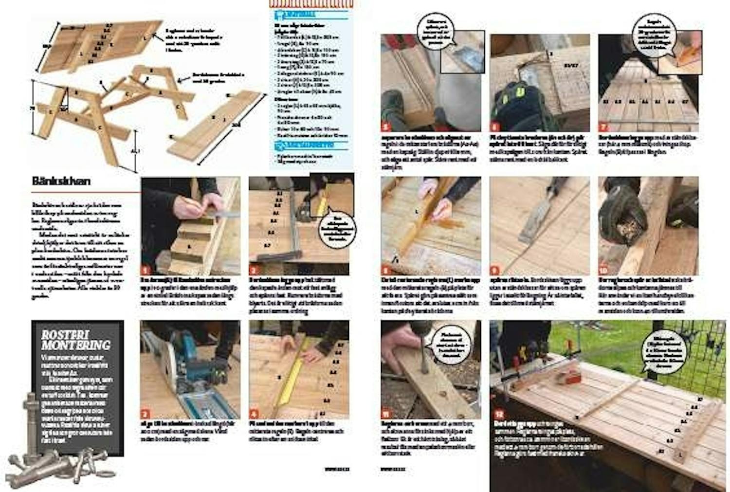 Bänkarna består båda av två brädor med en bredd på 12,5 respektive 20 cm. De hålls ihop på undersidan med två reglar på 40 cm med en vinkel på 30 grader i bägge ändar.