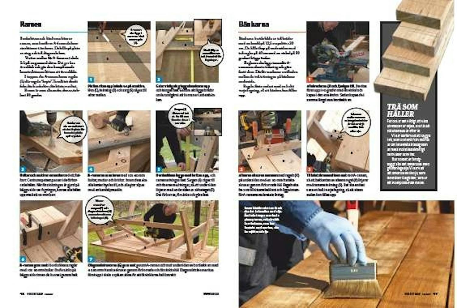 Bordsskivan och bänkarna bärs av ramen, som består av A-formade konstruktioner i ändarna. De hålls på plats av stag och två diagonala ben. Vi ritar mallen för A-formen i skala 1:1 på en gammal skiva. Det ger bra överblick och gör den komplicerade konstruktionen lättare att överskåda.
