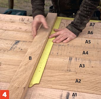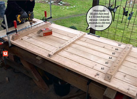 Brädorna (A) till bänkskivan streckas upp i 90 grader i den ena änden med hjälp av en vinkel. Brädorna kapas sedan längs strecken för att säkra en helt rak kant.