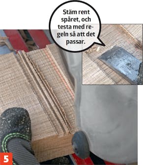 Separera bordsskivan och såga ut för regeln i de mittersta fem brädorna (A2-A6) med en kapsåg. Ställ in djupet till 5 mm, och såga ett antal spår. Stäm rent med ett stämjärn.