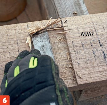 På de yttersta brädorna (A1 och A7) går spåret inte till kant. Såga därför försiktigt med kapsågen till 2 cm från kanten. Spåret stäms rent med en lodrät bakkant.
