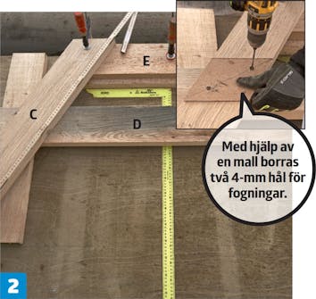Reglarna förborras med ett 4-mm borr, och skruvarna försänks med hjälp av ett flatborr. Ek är ett hårt träslag, så bäst resultat fås med en pelarborrmaskin eller ett borrstativ.