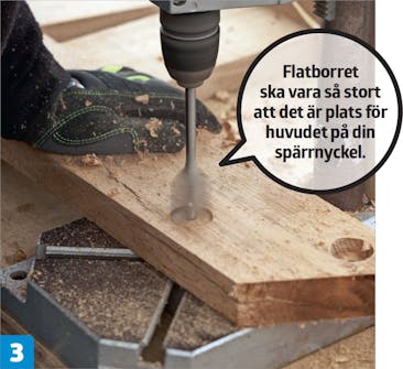 Bultar och muttrar försänks med ett flat-borr. Centrumspetsen passar i de förborrade hålen. När försänkningen är gjord på bägge sidor av fogningen, borras alla hålen upp med ett 10-mm borr.