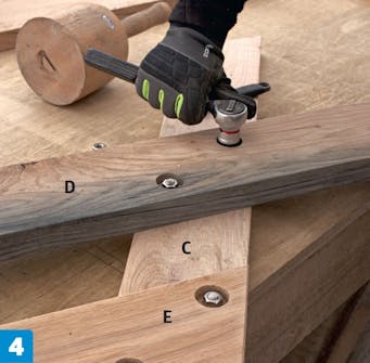 Bordsskivan läggs med botten upp, och ramarna tvingas fast. Sargen (F) sågas till och fixeras med tvingar, så att undersidan linjerar med undersidan av sidostaget (D). Det förborras, försänks och görs fast.