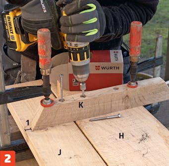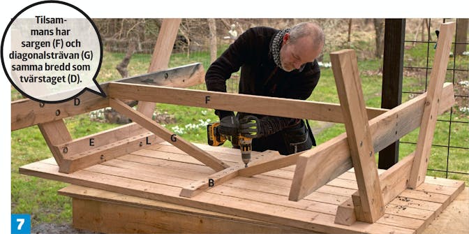 Sitsarna skruvas samman med regeln (K) på undersidan med 6 x 80 mm franska skruvar genom förborrade hål. Regeln ska ha 1 cm till sitsens bakkant och ligga innanför A-ramens nedersta tvärstag.