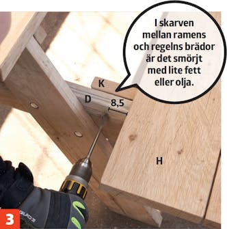A-ramen görs fast i bordsskivans reglar med 10 x 90 mm bultar. De försänks på bägge sidor innan de borras igenom helt.