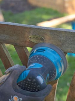 Kom ihåg att även slipa benen undertill. En del smuts tas snabbt bort med en excenterslip, så att träet blir mottagligt för oljan.