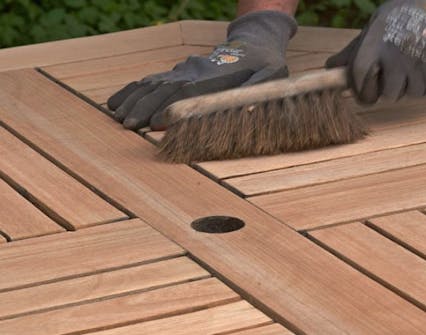 Bordsskivans ovansida och fötterna på benen utsätts för störst slitage, så här ska du se till att trädgårdsbordet mättas ordentligt med olja. Här används en klar grundolja med fungicider (mot svamp och röta), som framhäver träets egna färg.