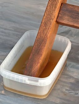 Rengör stolen med högtryckstvätt och vatten. Högtryckstvätten får bort de stora missfärgningarna på sitsen, så träet blir rent och fint. Därefter ställs stolen på torkning - ca ett dygn, om vädret är bra.