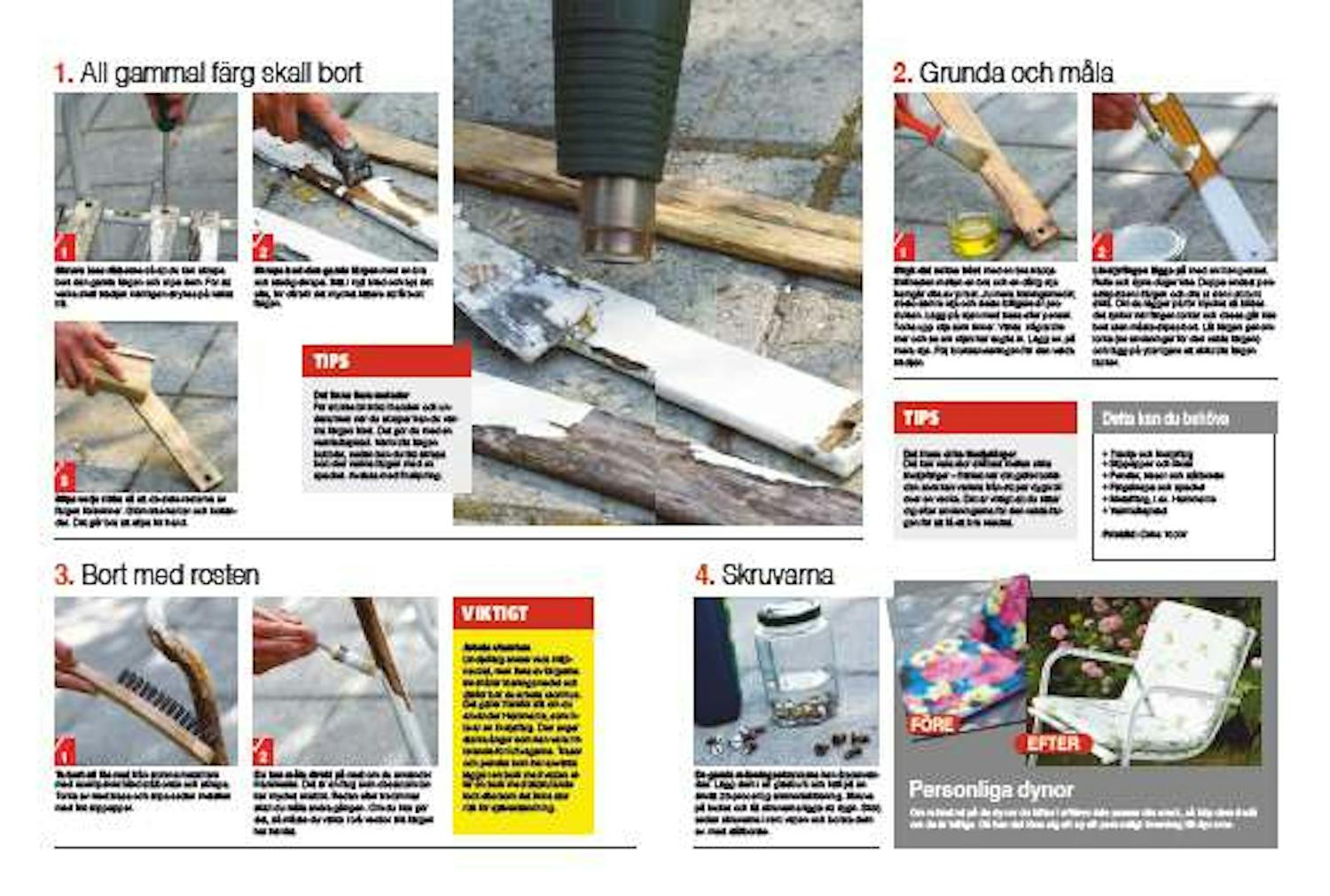 Ta bort all lös rost från stolens metallram med exempelvis hård stålborste och skrapa. Torka av med trasa och slipa sedan metallen med fint slippapper.
