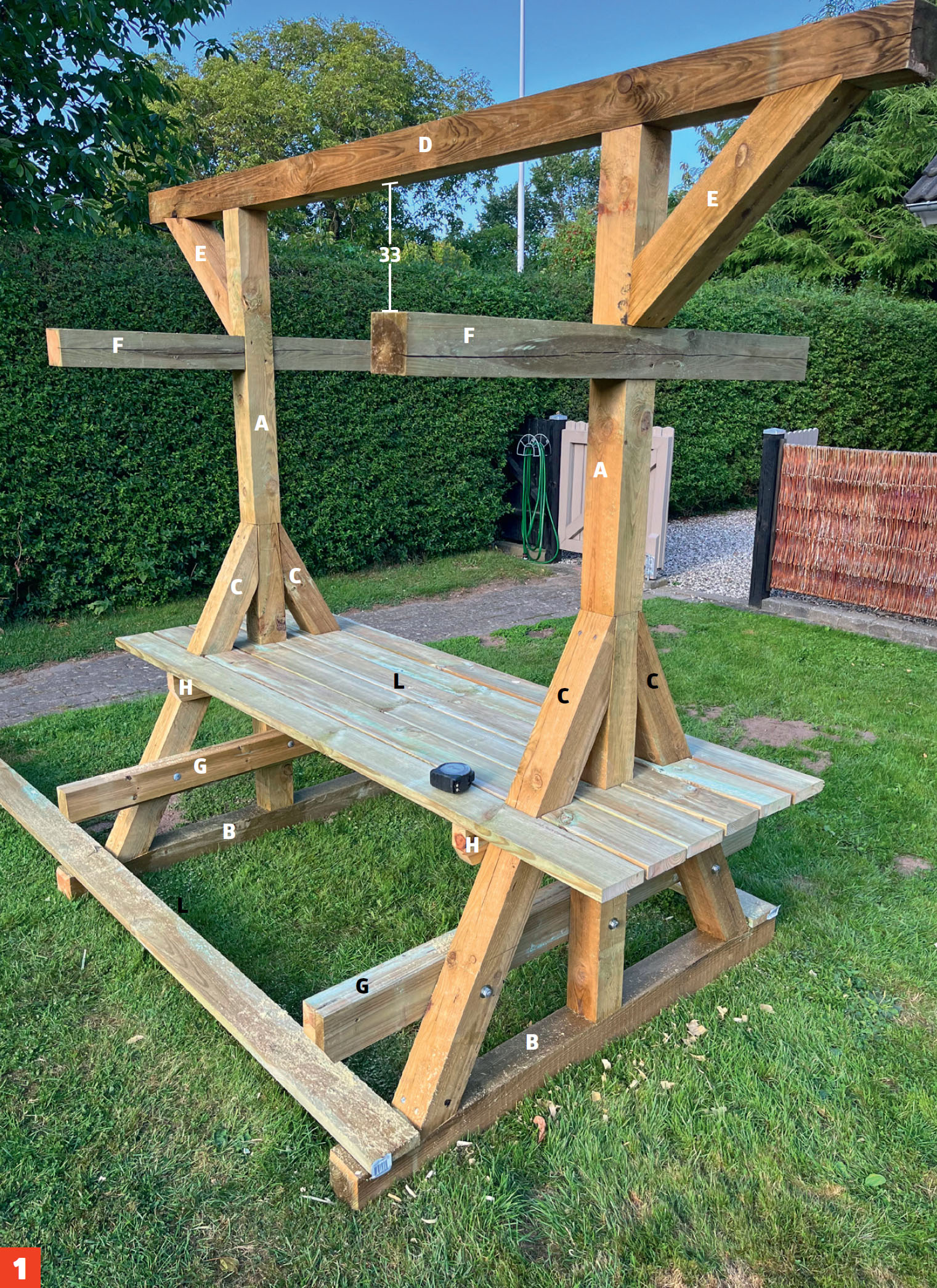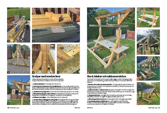 Montera två tvärslåar på stolparnas insida - en lång tvärslå (G) nederst till bänkar och en kortare (H) 30 cm ovanför till bordsskivan av trallbrädor (L). Tvärslåarna bultas fast i de kraftiga snedsträvorna (C).