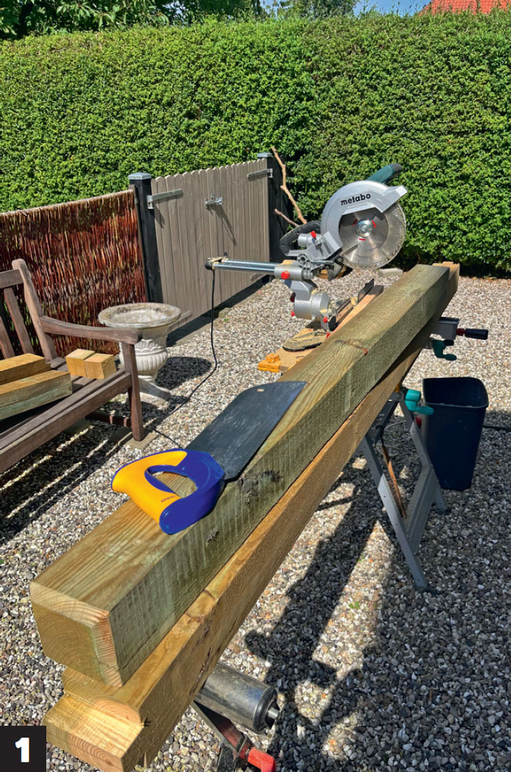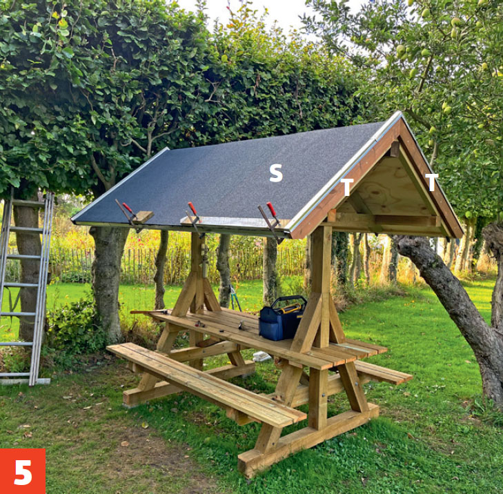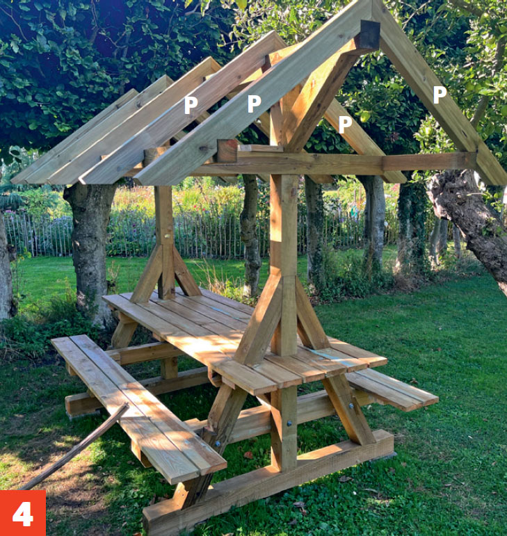 I båda ändarna av de två stolparna sätts infällda snedsträvor. Det gör konstruktionen av bänkbordet med tak otroligt stark.