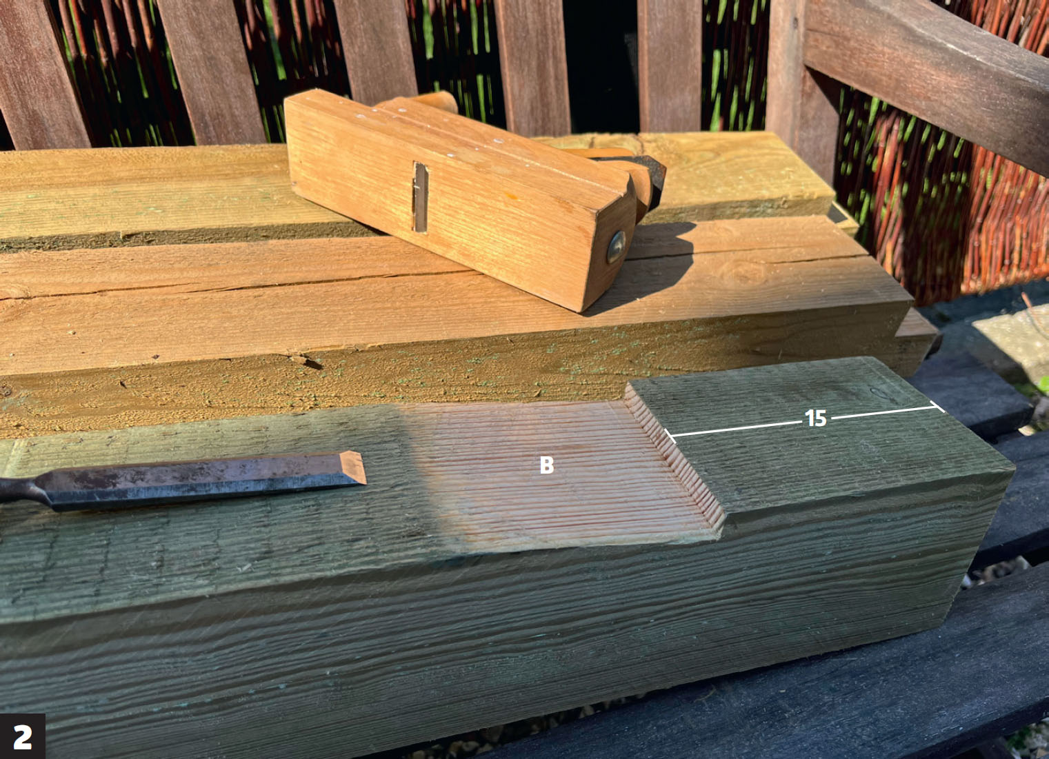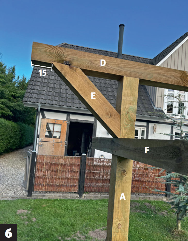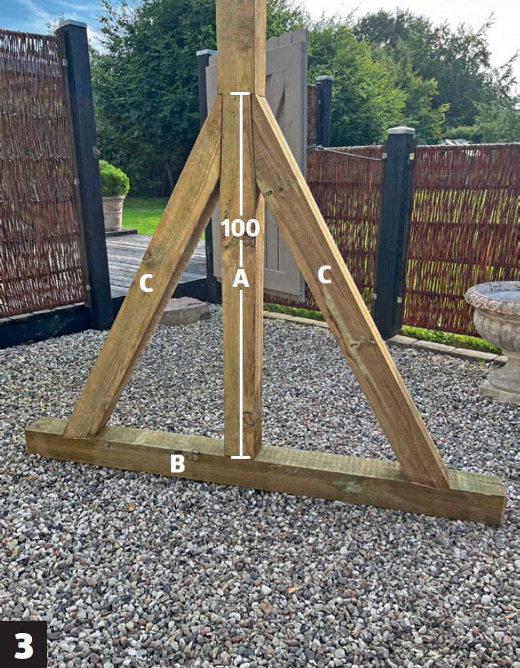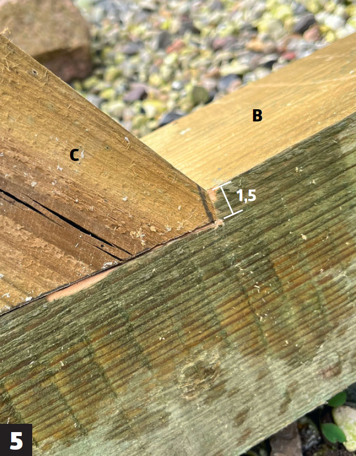 Ett hack görs i vardera änden av bottenbjälken (B) som den lodräta stolpen ska monteras vid. Stolpen stöttas av två snedsträvor som fälls in lite så att den står superstabilt. Gör ett snitt där snedsträvorna fälls in och ta bort träet med t ex ett vasst stämjärn och hyvel.