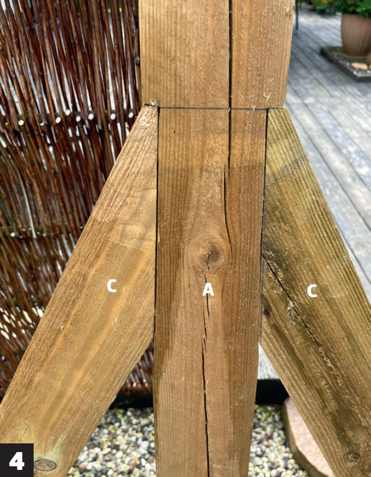 Mitt på stolpen (A) görs också två hack till snedsträvorna (C). Det gör konstruktionen otroligt stark, när snedsträvorna “integreras” i stolpe (A) och bottenbjälke (B).