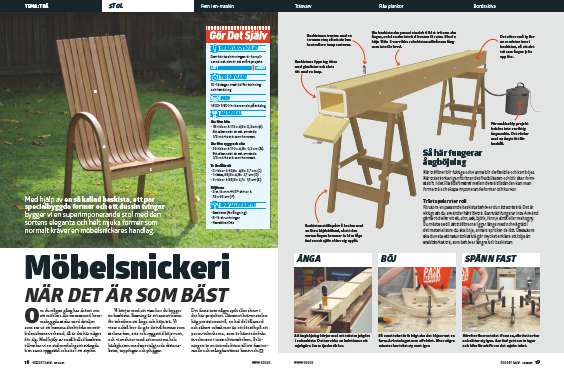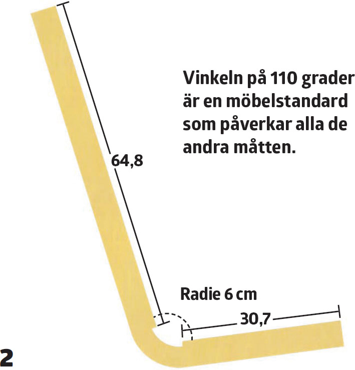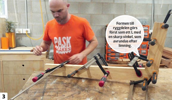 Gör formen till ryggstöd och sits, som liknar ett L. Den ska vara 110 cm lång på utsidan. Vinkeln är 110 grader. Insidan har sågats till så att det blir lättare att sätta på tvingar. Använd hyvlade brädor till formen.