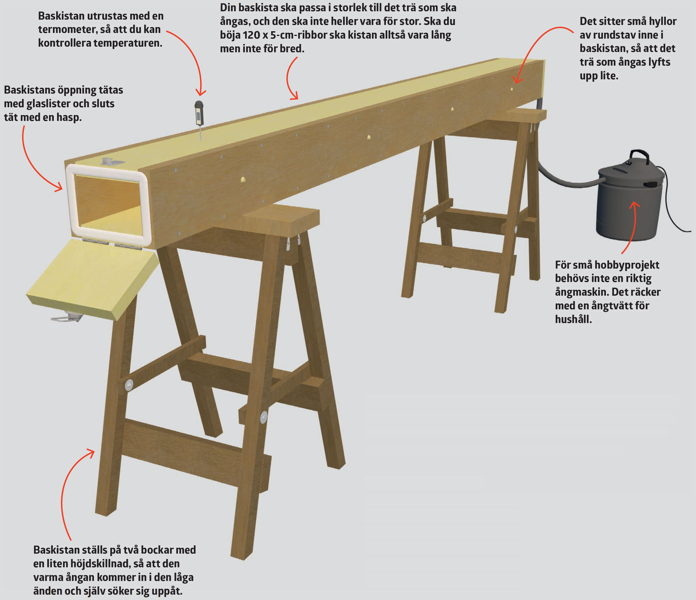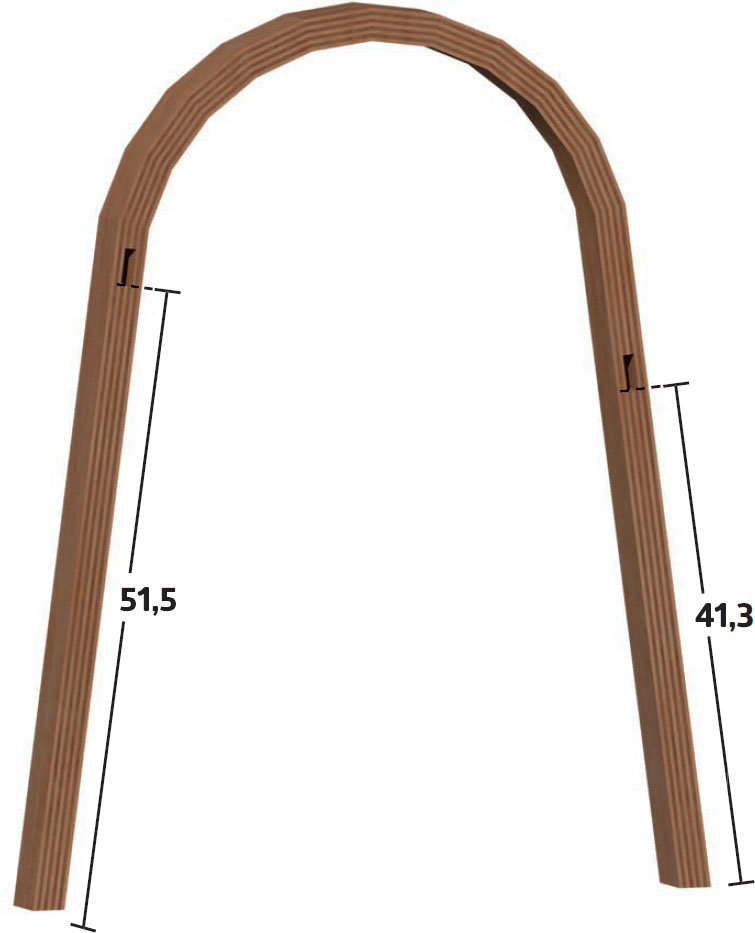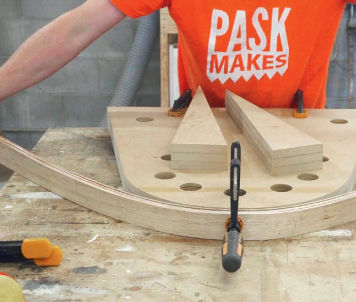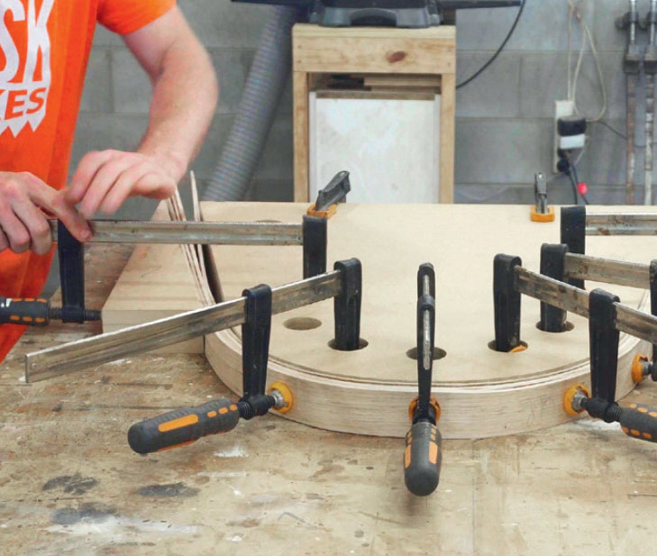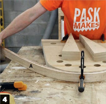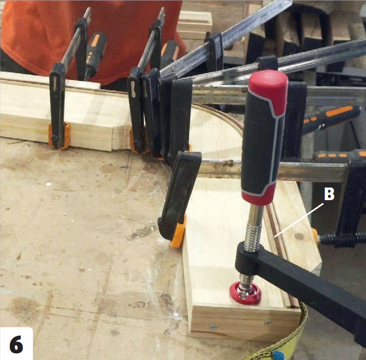 Ånga nio ribbor (A) i minst 30 minuter och böj dem sedan direkt runt formen. Ribborna böjs tillsammans och sätts i spänn med 8-12 tvingar som sätts i hålen på kanten. Träet är varmt, så kom ihåg handskar.