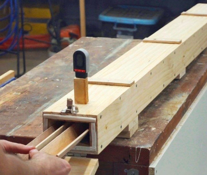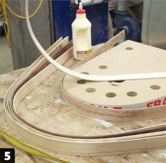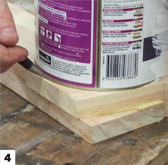 Vänta ett halvt dygn medan träet torkar. Tag bort tvingarna. Du märker att träet böjer sig lite bort från formen. Nu ska listerna limmas och därefter tillbaka i formen, där limmet ska härda. Använd trälim.