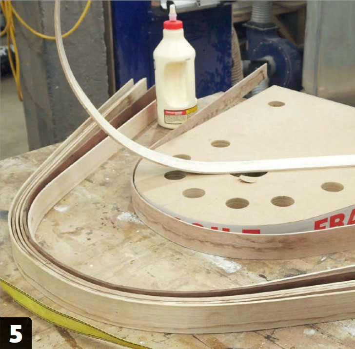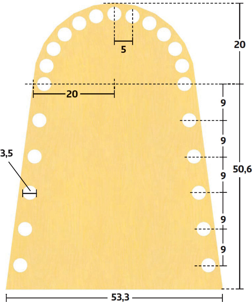 Såga ut den klockformade formen och slipa. Det är viktigt att kanterna är helt släta, annars är risken att du får märken på de ribbor som böjs runt formen. Borra dessutom en rad 5,5 cm-hål längs kanten.