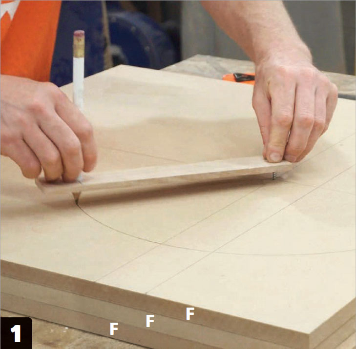 Limma ihop de tre MDF-skivorna (F). Rita ett streck som delar skivorna på längden. Rita ännu ett streck som delar skivorna på tvären 20 cm från ovankanten. Rita en cirkel med 20 cm radie med centrum i krysset.