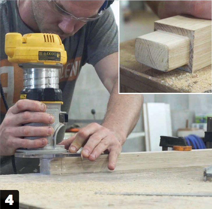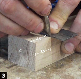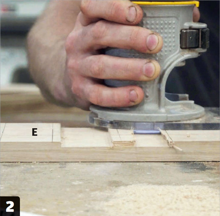Använd handöverfräs eller stämjärn för att ta bort 0,3 cm trä från de 4,8 cm breda fälten. Kolla löpande så att fördjupningarna passar till rygg- och sitsdelarna. Alla tre ribborna (E) ska ha likadana mönster.