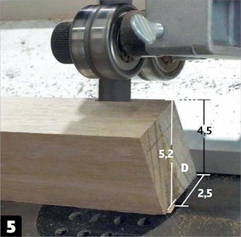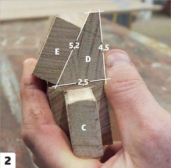 Montera den ribba som har sågats i vinkel (D) ovanpå en tvärgående ribba (C). Använd lim. Använd också ett par dolda tappar. Det ska finnas plats för en distans på den sneda ytan. Den limmas inte fast än.